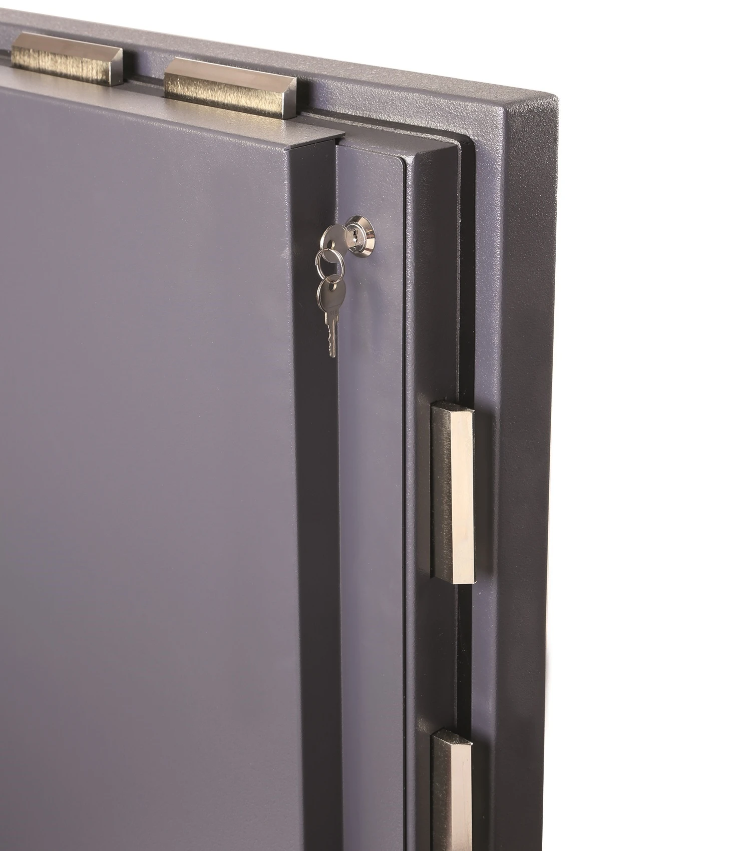 - Сейф HS2054E оборудуется четырёхсторонним ригельным механизмом, представленным девятью прямоугольными стальными ригелями 100×10 мм – выдвигающимися с трёх сторон, а также пассивными (неподвижными) со стороны петель.